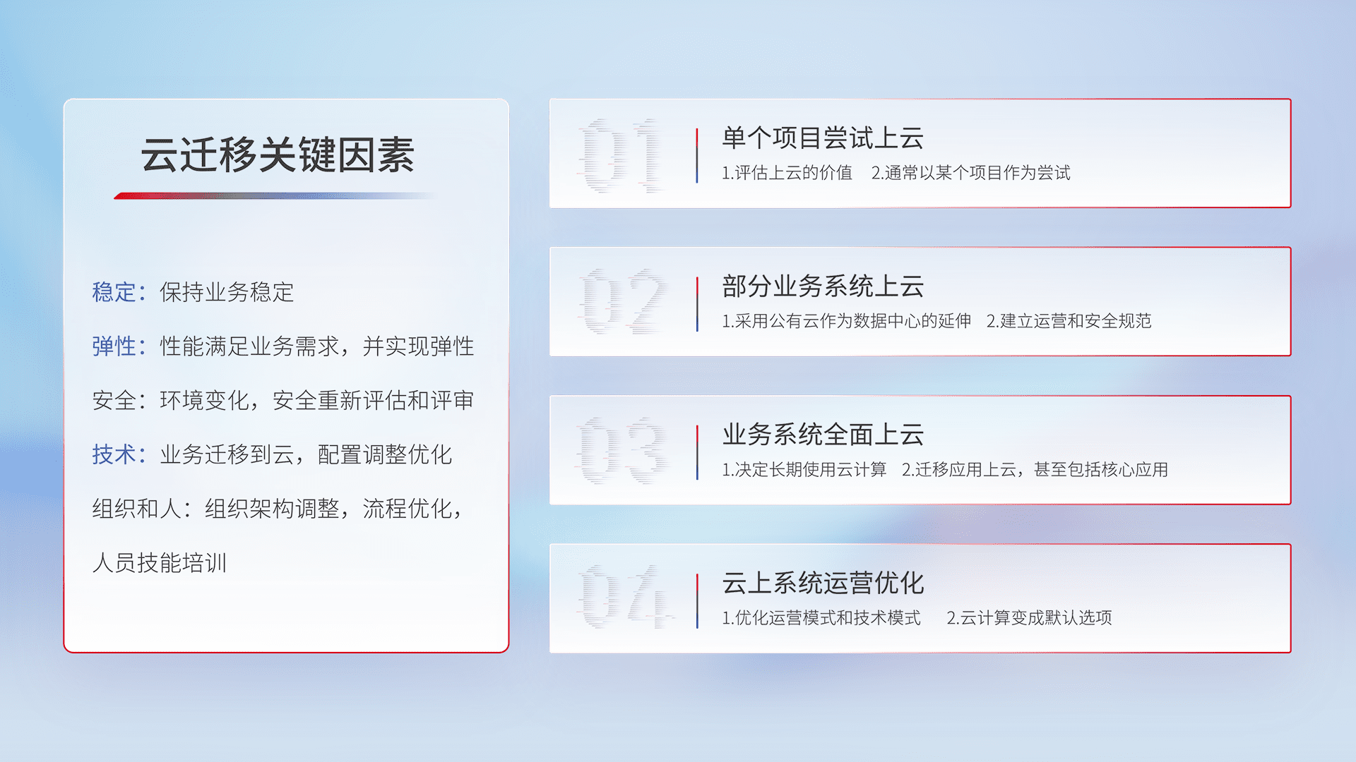 结合实际业务,,,从规划设计、、、云平台选型、、、、云原生改造、、、数据迁移、、集成交付,,,迁移全过程为客户识别最佳上云路径,,,,做好风险识别管理,,,设计网络架构、、、身份权限、、安全审计合规、、操作审计、、日志审计、、监控告警策略、、多站点容灾设计等,,对云上基础设施进行整体规划,,提升IT治理水平,,以满足弹性、、高可用、、高性能的需求。。。